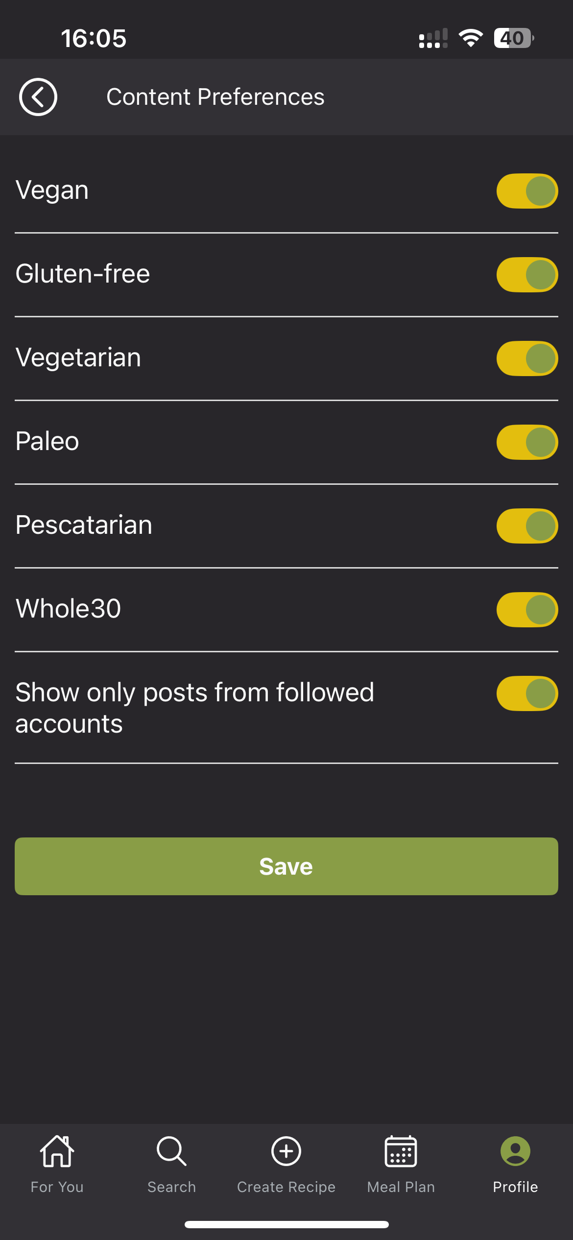 Allows users to choose topics of interest (e.g., vegan recipes, desserts, etc.).